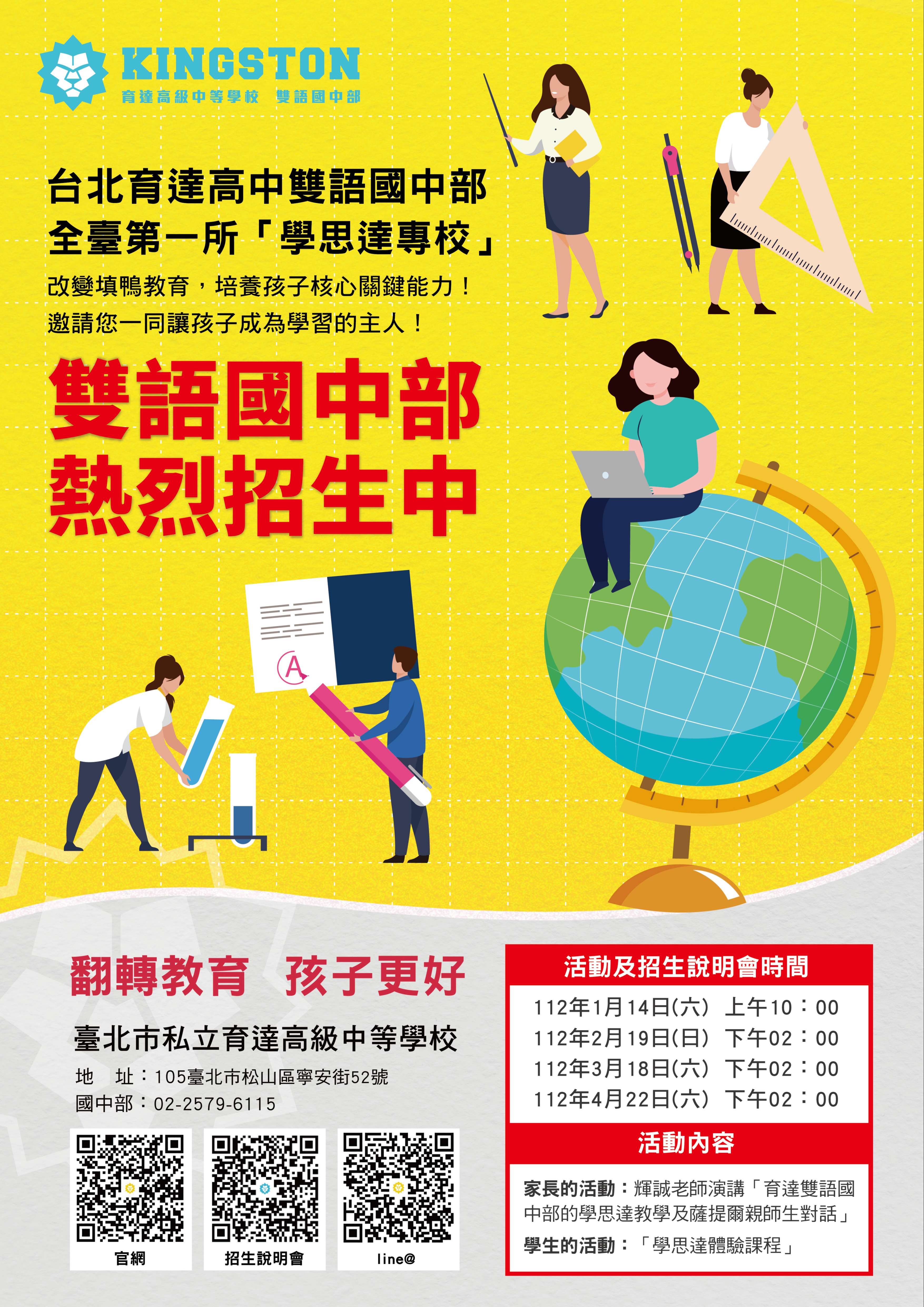 一、本校訂於112年1月14日上午10:00、2月19日(六)下午2:00、3月18日(六)下午2:00、4月22日(六)下午2:00,為家長特別邀請學思達創辦人張輝誠老師演講「育達雙語國中部的學思達教學 薩提爾親師生對話」及為同學們舉辦之「學思達體驗課程」,歡迎 貴校應屆畢業生與家長報名參加。