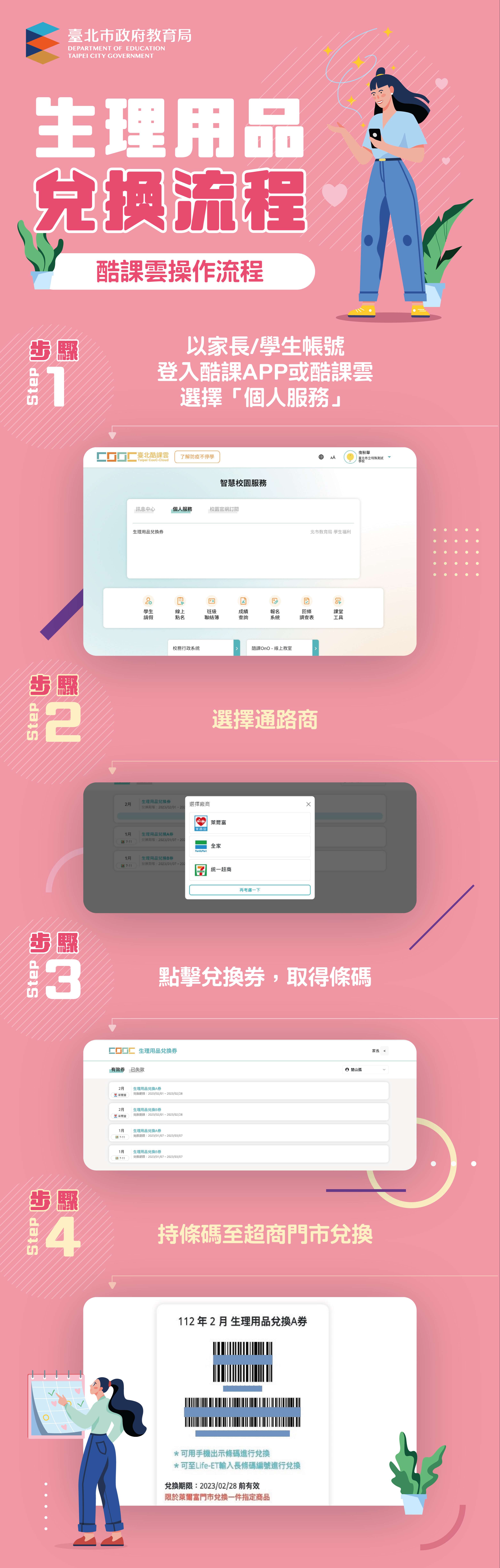 (四)使用方式:每月2張兌換券,每張100元,每券可兌換指 定生理用品一項,不接受補差額或要求找零,亦無法與 門市其他促銷優惠同時使用。
