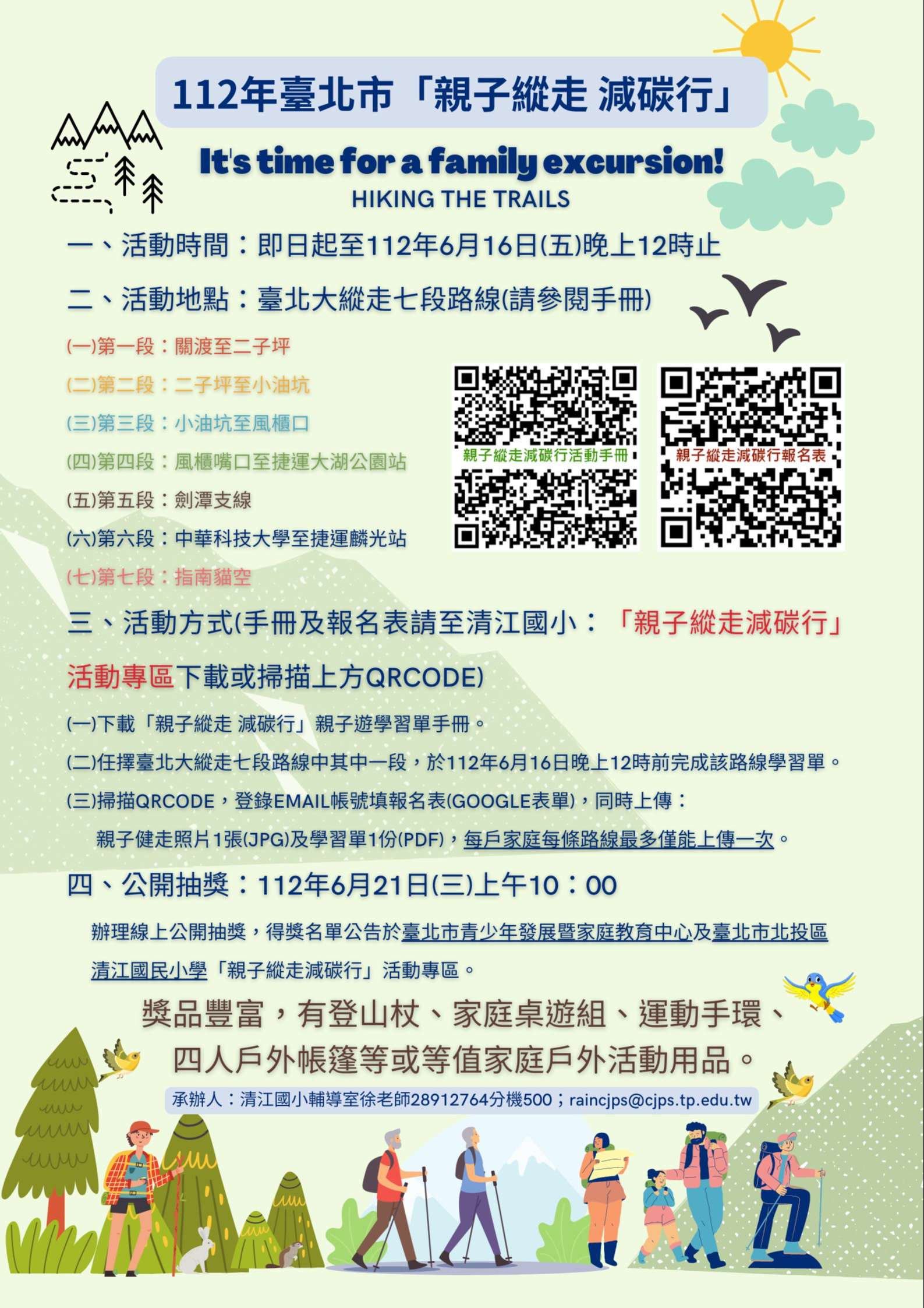 五、本活動訂於112年6月21日(星期三)上午10時辦理線上公 開抽獎,得獎名單公告於臺北市青少年發展暨家庭教育中 心網站及臺北市北投區清江國民小學「親子縱走減碳行」 活動專區。