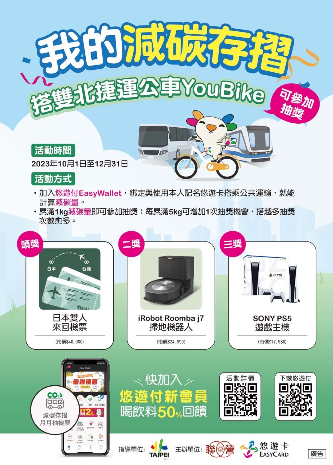 三、上開活動於112年10月1日至112年12月31日止,只要加入 「悠遊付Easy Wallet」APP會員,綁定與使用本人記名悠 遊卡,搭乘雙北公共交通運具(公車、捷運、輕軌及 YouBike)就能計算減碳量。累計滿1kg減碳量即可獲得當 月抽獎資格1次,每累計滿5kg,可再增加1次抽獎機會,累 計滿10kg則多2次,以此類推,搭乘公共運輸越多,就有越 多中獎機會。