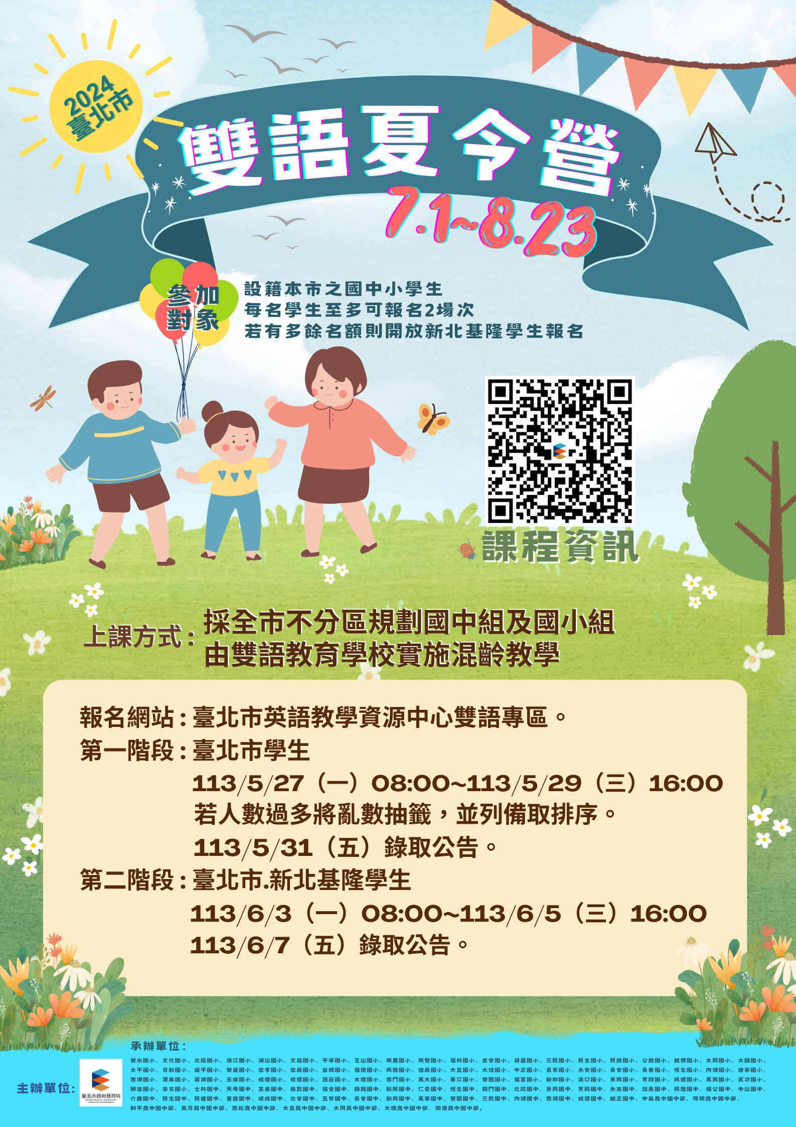 5、於113年5月27日(星期一)上午8時起在臺北市英語教學資源中心雙語專區(https://ecamp.tp.edu.tw /bilingual/index.php)開放網路線上報名。