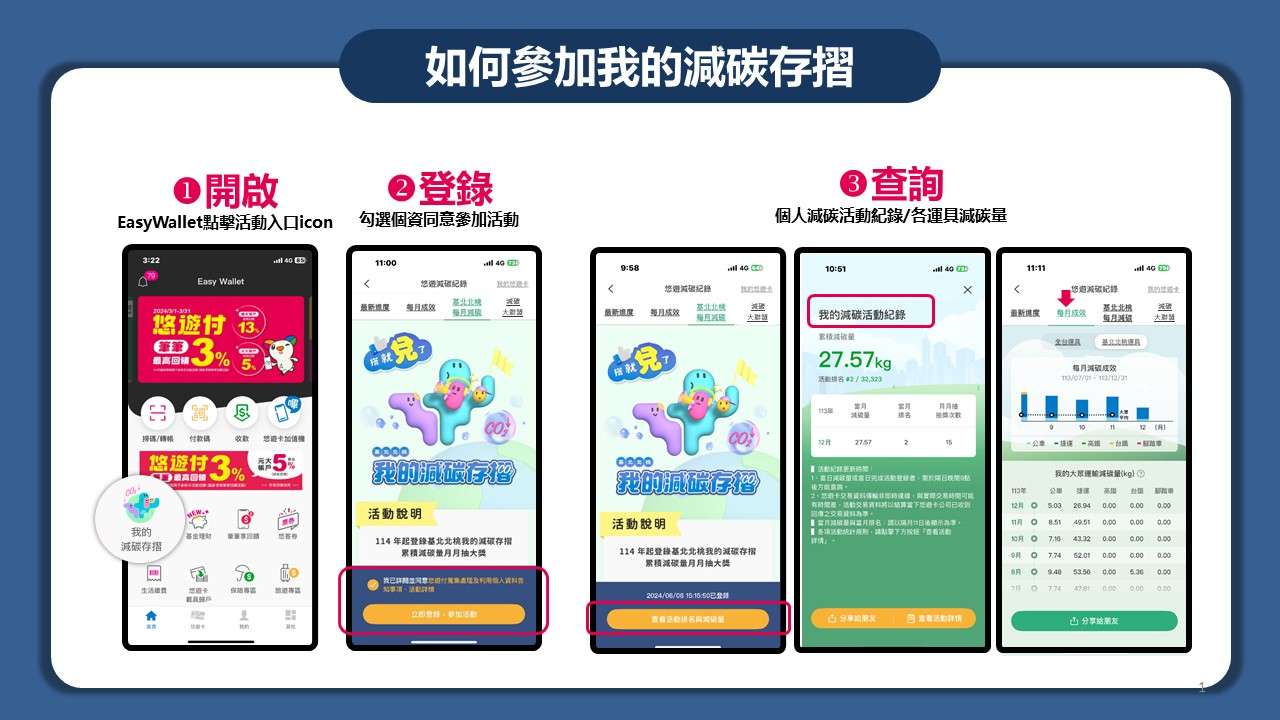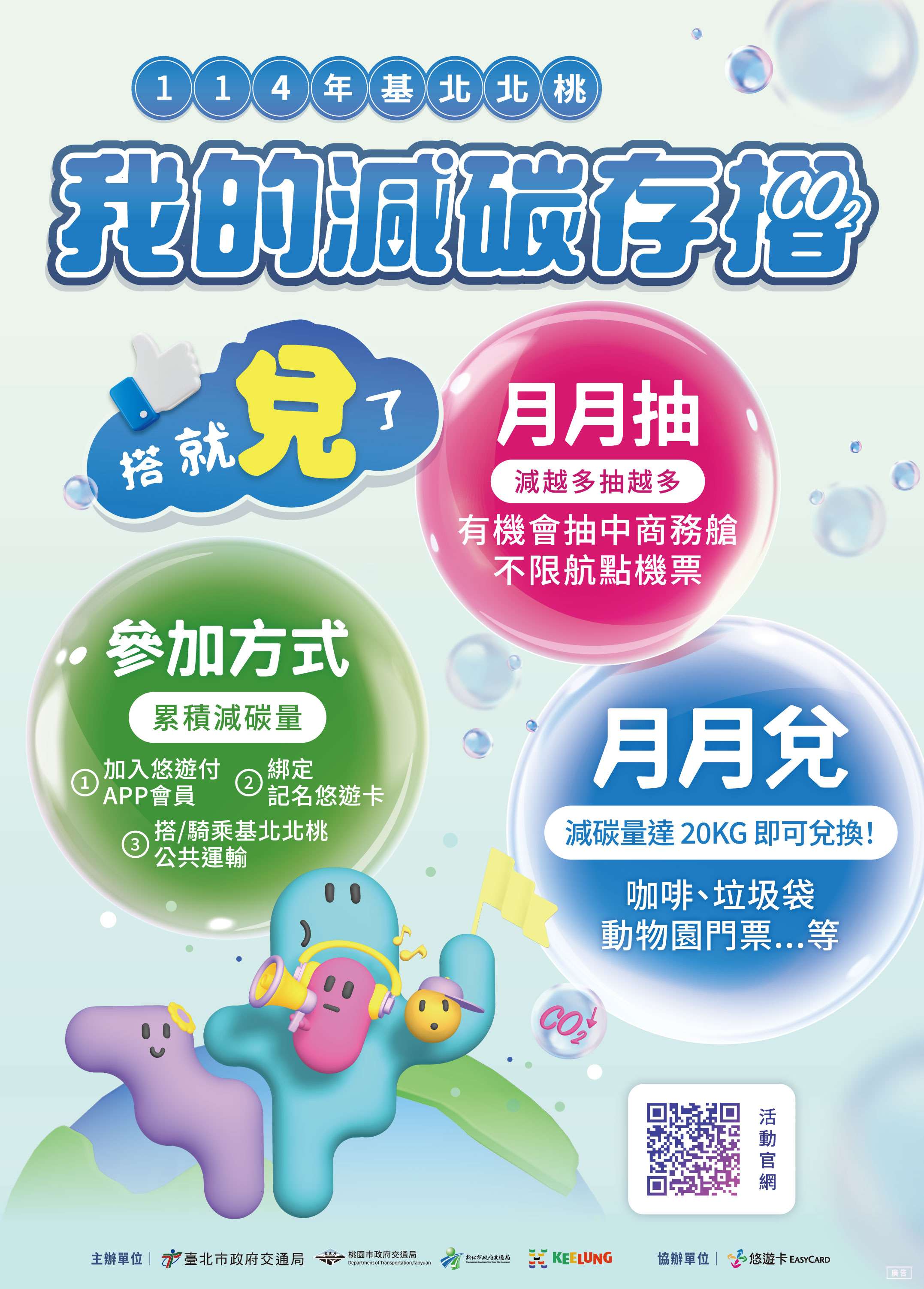 一、為攜手市民多加使用公共運輸,以朝淨零碳排目標前進, 由政府、企業一起帶動全民綠運輸減碳,113年由基北北桃 四市交通單位、公共運輸業者及悠遊卡股份有限公司共同 推動,114年度擴大辦理並增加兌獎制活動,民眾累積達一 定減碳量即可登錄兌換獎項,提高民眾參與誘因,活動辦 理期間自114年1月1日至12月31日止,詳細內容可至本活動 官網查閱114年活動資訊(https://co2- passbook.com /)。