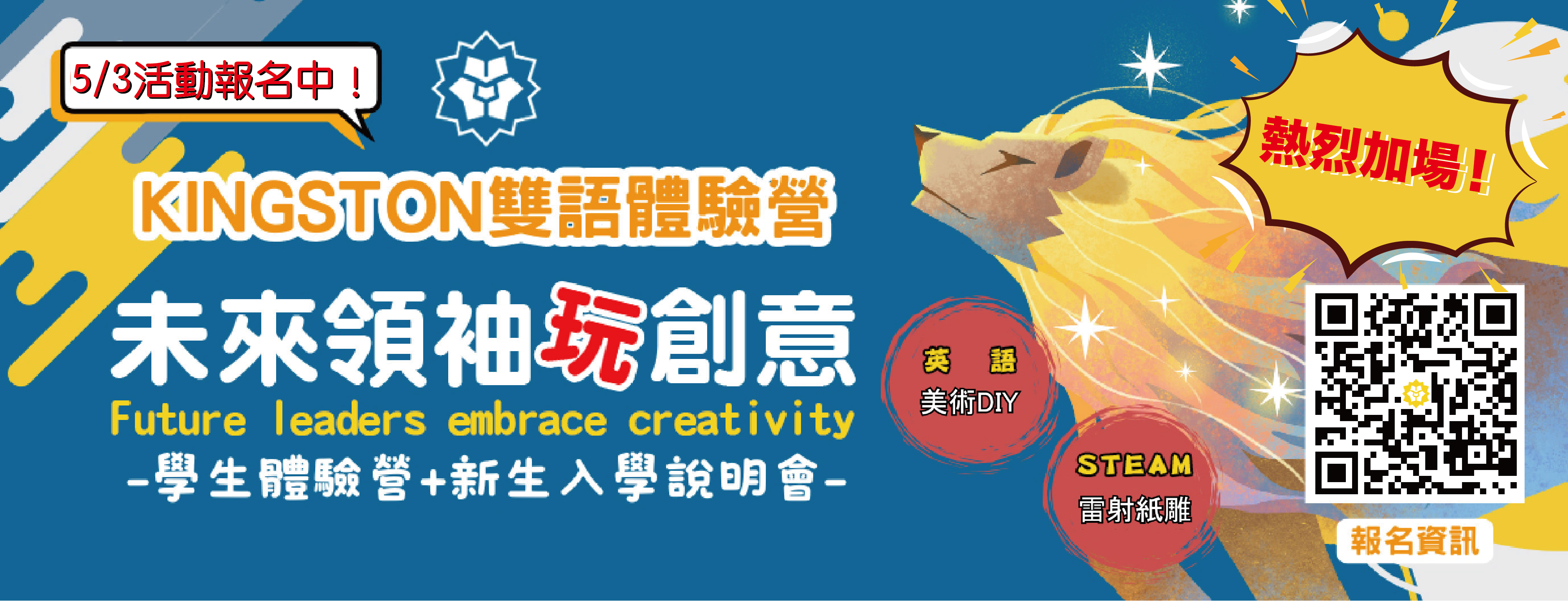 一、目的:【未來領袖玩創意-Kingston 雙語體驗營】在全球化 的時代,創造力與雙語能力是孩子未來發展的重要資產, 本次 Kingston 雙語體驗營集結本校外師與中師,以「雷 射紙雕STEAM」與「英語美術DIY」為主題,設計一系列豐 富有趣的體驗課程,我們也在同一時間安排114學年新生入 學說明會,深入介紹本校的課程規劃與環境導覽,並解答 您的所有疑問,歡迎家長帶著您的孩子一起報名參加!