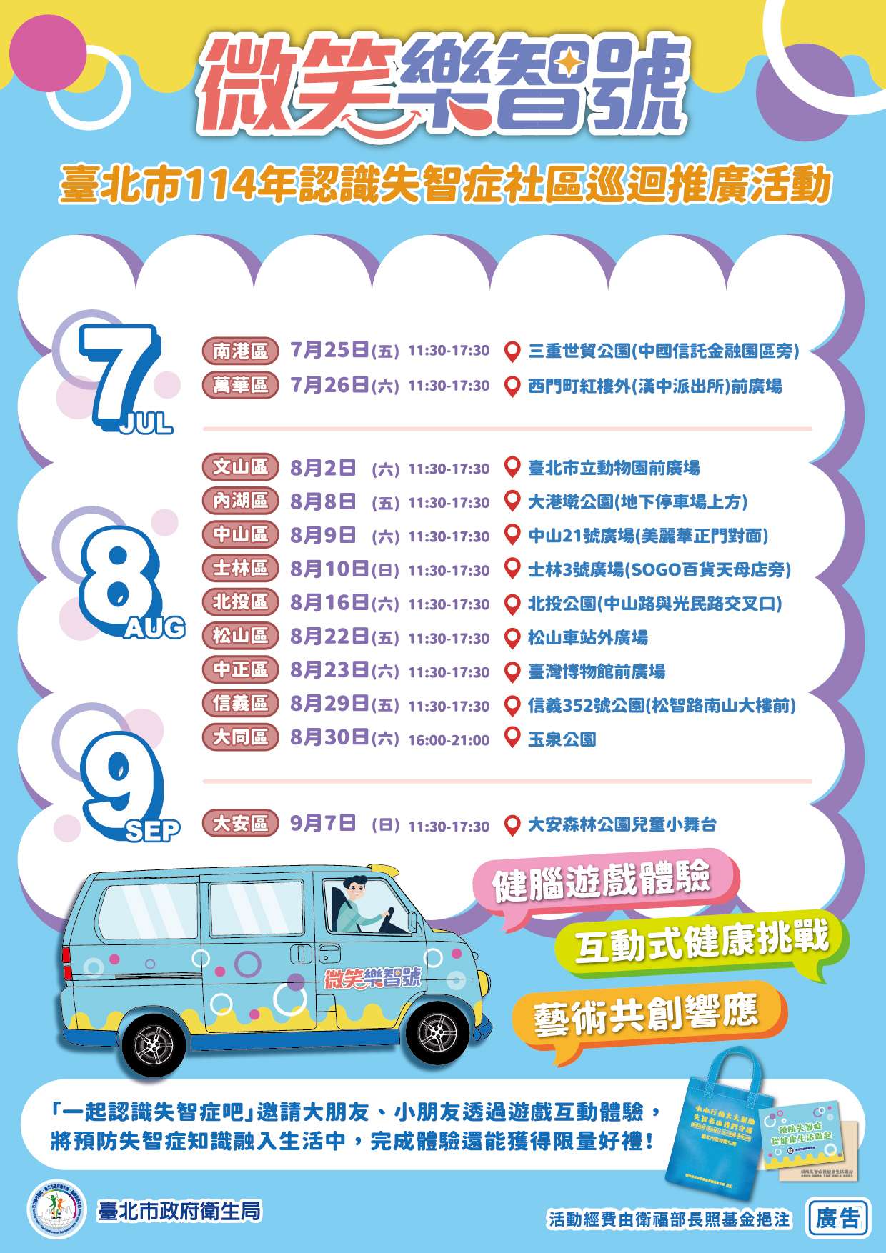 為增加民眾對失智症的認識及預防,衛生局114年結合「微笑 樂智號」胖卡車,規劃「健腦遊戲體驗」、「互動式健康 挑戰」、「藝術共創響應」等多元內容,巡迴本市十二行 政區,藉由趣味互動吸引民眾參與,將失智症知識融入生 活中。